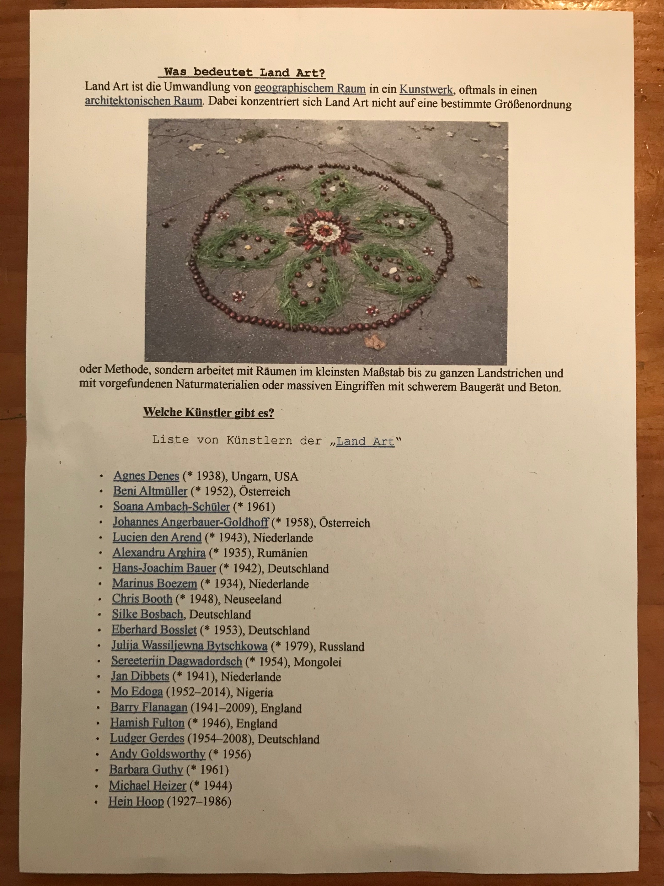 Zum Thema Land Art gestalteten SchülerInnen der 6. Jahrgangsstufe richtig kleine Kunstwerke. Hier ein besonders gelungenes Beispiel. Glückwunsch dazu!